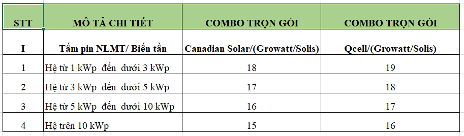 Đối với hộ gia đình, các văn phòng nhỏ, Chúng ta có thể lựa chọn những gói có công suất nhỏ hơn. Cụ thể như sau (ĐVT triệu/kWp):