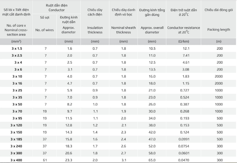 Thông số kỹ thuật: Cáp điện 3 lõi không có giáp bảo vệ 0.6/1kV – Cu/XLPE/PVC/DATA/PVC